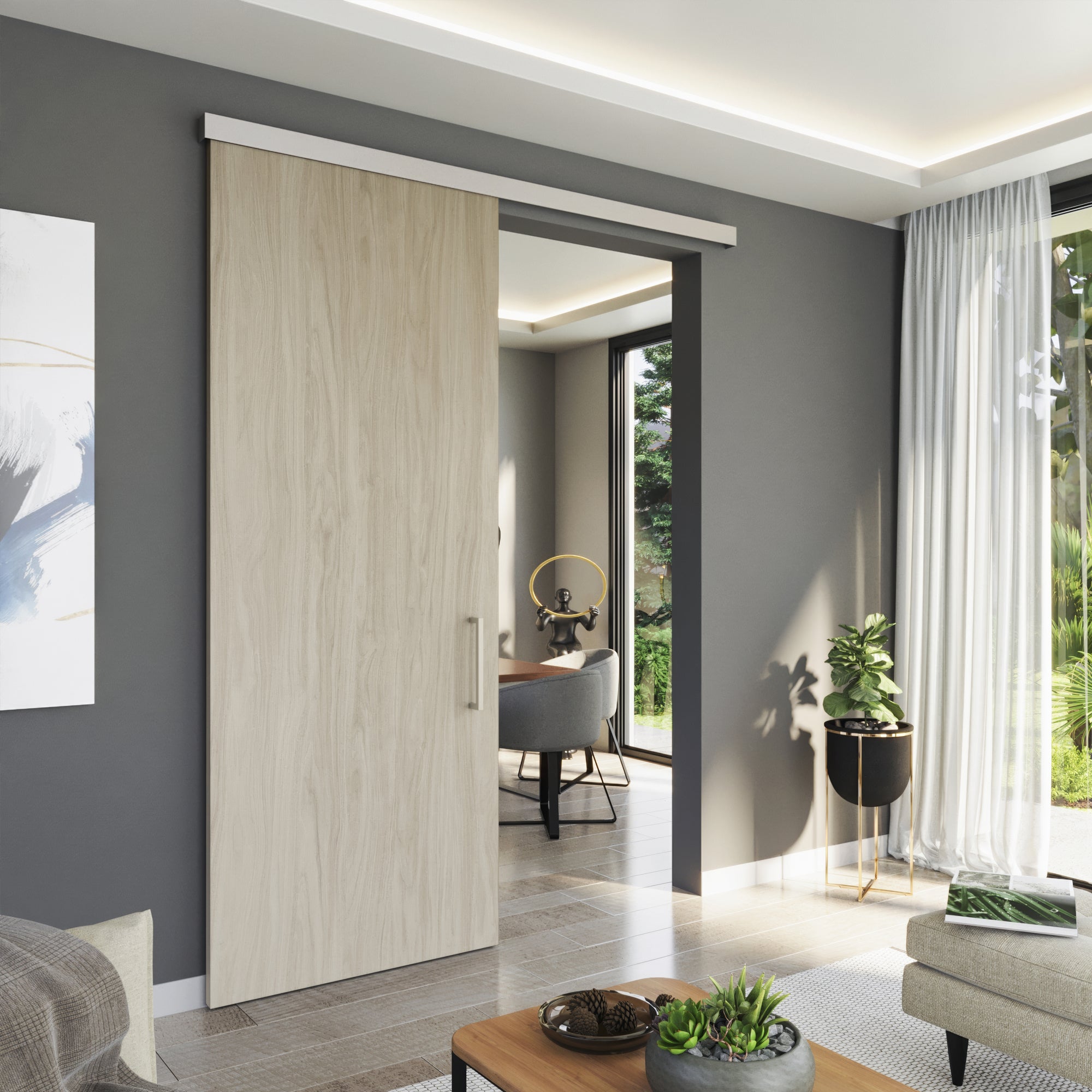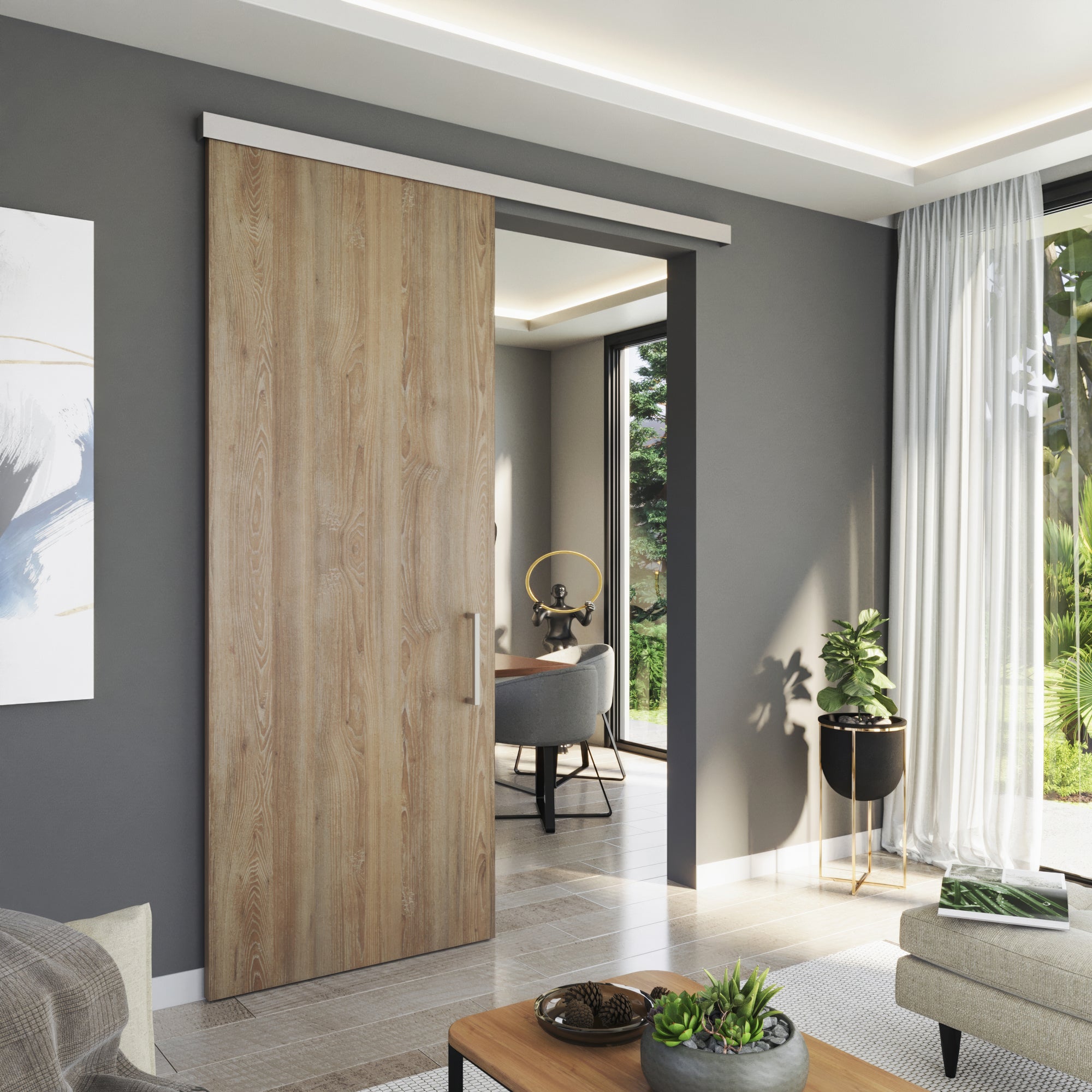 The Barn Door System blends rustic charm with architectural precision. Sliding elegantly across the wall on an exposed track, it becomes both a functional divider and a visual statement. Bosko reimagines this timeless form in fine wood and metal, giving it the sophistication required for modern interiors.
